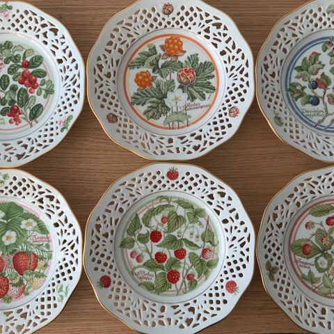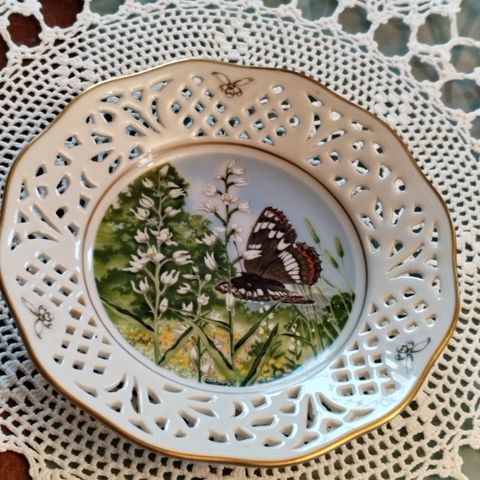 Nydelig vintage frukttallerken i bavarisk porselen fra Schumann Arzberg. Tallerkenen har et vakkert fruktmotiv (Prunus domestica) og en elegant gjennombrutt/retikulert kant med gulldekor som gir et svært dekorativt uttrykk.