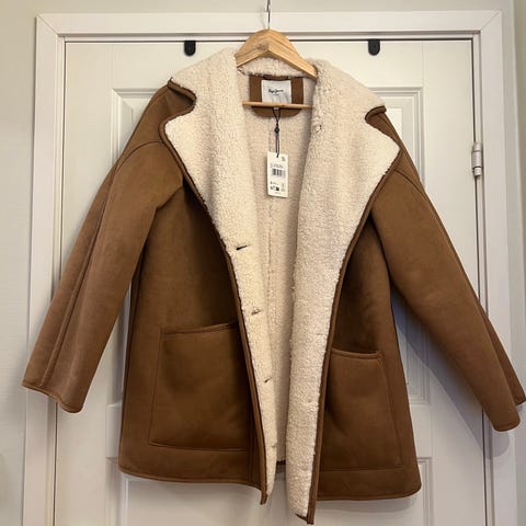 Selger denne fine imiterte saueskinnsjakken. Den er kun brukt et par ganger og fremstår som ny. Har hengt i skapet i noen år. Selges for kr 200,-.