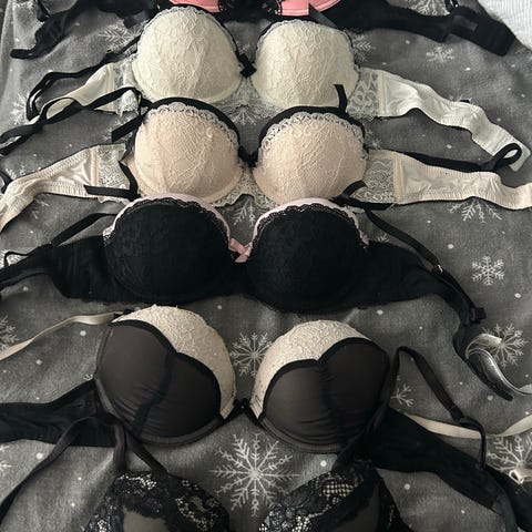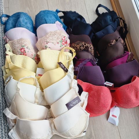14 bher i str. 80DD. Stort sett bare fra Lindex. Flere nye og ubrukte. Og stort sett som nye allle sammen. Ingen som er mye brukt eller utvasket. Den ene hvite har en flekk på kanten, se bilde. Men siden den er ny med lapp så er ikke flekken prøvd vasket bort. 14 bher, ca 100 kr stykk.