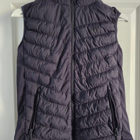 Pent brukt blå vest str 14,år selges rimelig. Vesten har lommer med glidelås på hver side.