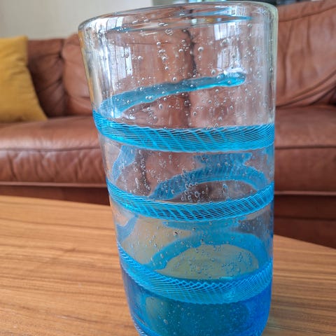 Vasen har en lite boble inni glasset nære toppen. Syns på det siste bildet. Glasset er glatt der på begge sider.