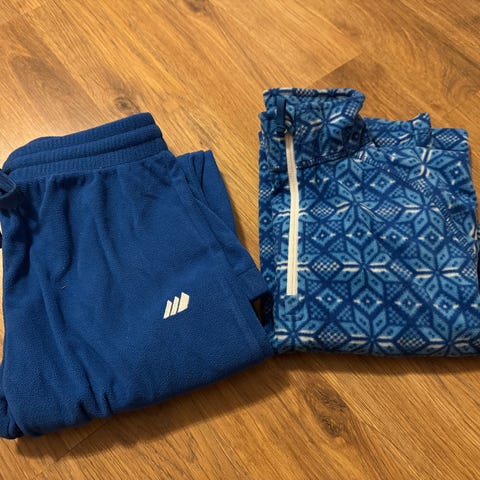 Tykt og godt fleece sett fra Skogstad i blått i str.116. Ingen hull eller rifter men har noen flekker som ikke har gått av i vask. Nyvasket og klart til bruk.