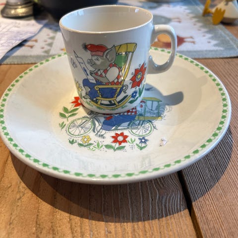 To søte dype barnetallerkner fra finske arabia. En lyseblå skål og en rosa.