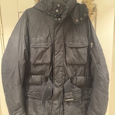 Svart herlig parkas fra Ralph Lauren i str. L. Nydelig stoff rundt nakken. Herlig pels i hetta. Belte i livet og snøring i li et på innsiden. Kraftig glidelås. Mange herlige detaljer.