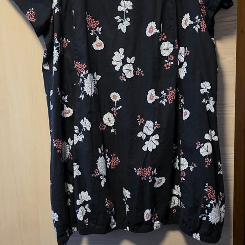 Marineblå bluse med blomster foran og ensfarget bak.