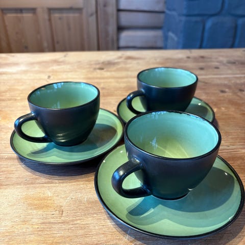 Seks så å si ubrukte romslige og robuste kaffekopper med skål. De er fra franske Revol og er i en lekker blåfarge med gullkant og kremfarge inni koppene.