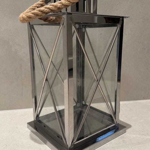 Koselig Rustikk Lyslykt av glass og metall. 29cm høy. Glass på alle sider som er hele. 29cm høy. Bredde og dybde er 13x13cm. Lys medfølger ikke. Gir god stemning i hjemmet eller hytten når høst og vintermørket siger på.