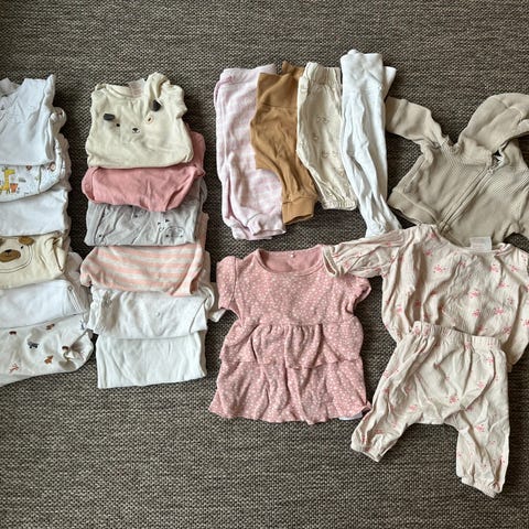 12 bodyer, 8 bukser, 1 strømpebukse, 2 luer med votter, 1 komplett skjorte+bukse