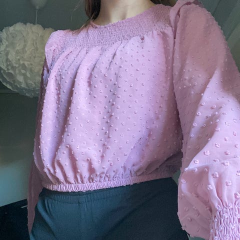 Selger en fin genser/bluse med fine detaljer. Blonder og nuppereller. Ligner litt Newbie synes jeg. Herlig ferskenrosa farge. Ikke sikker på stoffet, men føles ut som bomull-stretch. Står ingen størrelse, men passer meg som er Small/Medium.