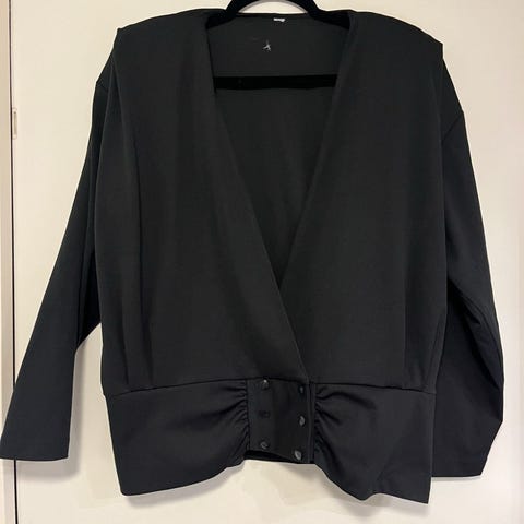 •Om blazeren: Har to lommer foran. Masse vakre perler på ermet, foran og bak i nakken. Den har et avtagbart panel foran som festes med knapper på innsiden, og den er like kul med og uten panelet. En stor og pen knapp foran. Har glatt fór.
