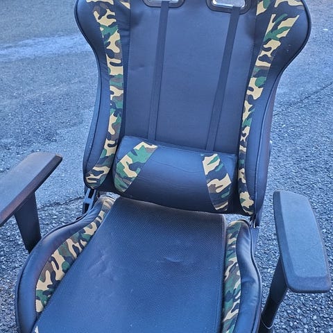 Piranha Bite Gamingstol i fargen kamo / kamuflasje selges. Stolen har noen bruksmerker, men den er pent og lite brukt, så den er i veldig god stand. (Klikklåsen til den avtagbare nakkeputen er sprekt i plasten.)