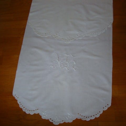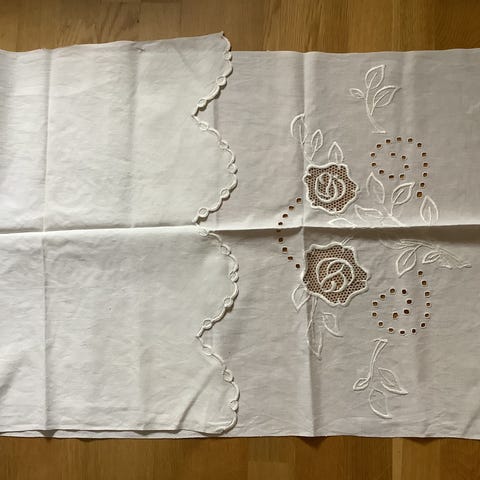 Nydelig rund linduk med bredt broderi rundt kanten. Fuglemotiv.