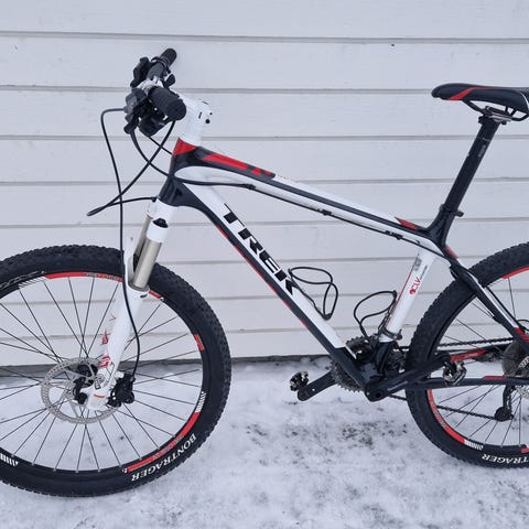 Dette er en 2014 Jamis terrengsykkel som har 44.45cm sykkelramme og 66cm hjul. Den har vært på service i September 2024, og fikk et helt nytt hydraulisk bremsesystem som inkluderer sykkel bremsekalipere, bremseklosser og sykkelroterer. Den har Shimano Deore XT sykkel gir og Tekto bremser. Den har Skareb 80mm pneumatisk foran sykkeldempere.