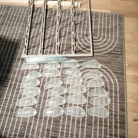 4 stk hvite hyller til IKEA Pax selges samlet. Oppheng følger med. Nypris 130 per stk.