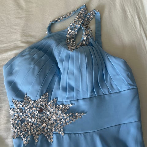 Denne vakre kjolen kommer i en nydelig turkis farge og er sydd i et elegant stoff. Brystpartiet er spesielt flott og gir kjolen et sofistikert uttrykk.