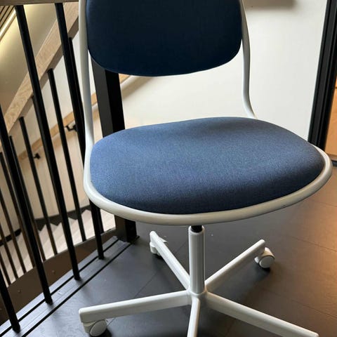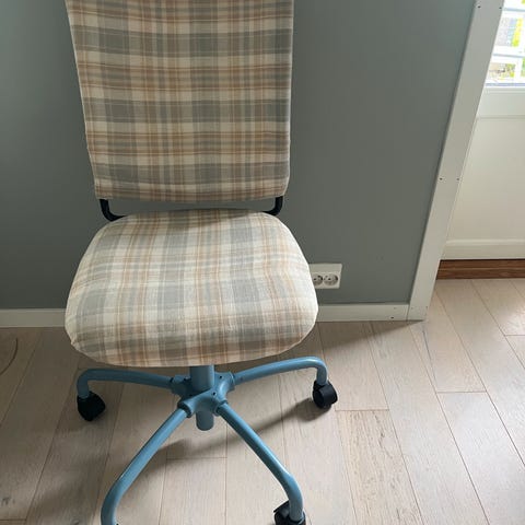 Kontorstol for barn selges. Noe av stoffet på undersiden av setet er litt revnet (se bilder), ellers er det ikke noe galt med stolen som har mye bruk igjen.