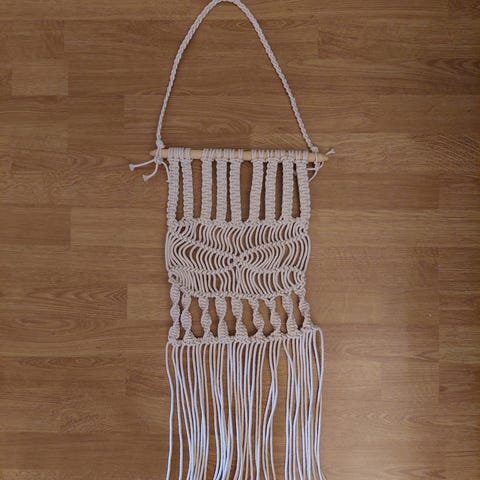 Har laget denne macrame lille gardinen, var ment for døråpning i campingvogn (poletta 1977)men kan sikkert også brukes til forskjellig pynt etc. Måler ca 37cm+- i bredde og 140cm +- i lengde.