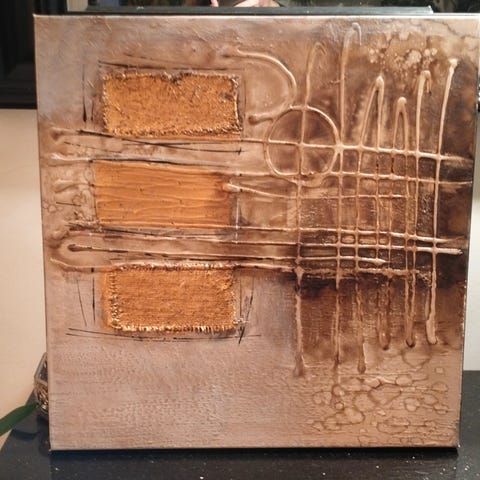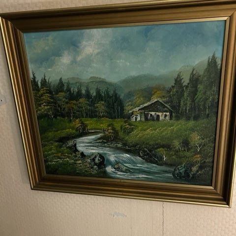 Malt pynte/veggbilde selges. Mål inkl ramme 65 cm x 65 cm. Må hentes, sender ikke.
