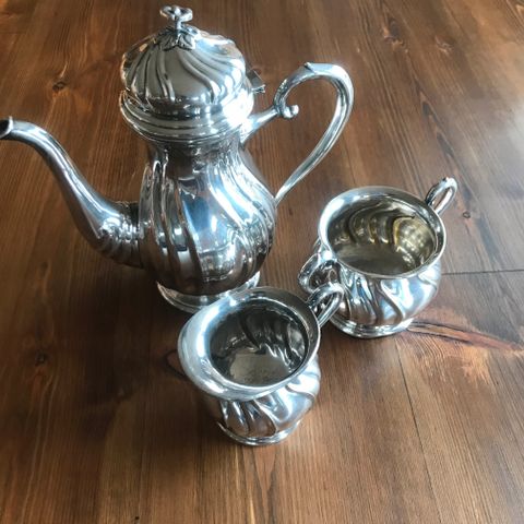 Eldre kaffekanne med sukkerskål og fløtemugge i sølvplett. Stemplet TB og to tårn. (tror det er dansk) Pent brukt, trenger en puss. Kaffekanne høyde ca 22 cm, sukkerskål diameter ca 9 cm høyde ca 5 cm, fløtemugge diameter ca 7 cm høyde ca 5 cm.