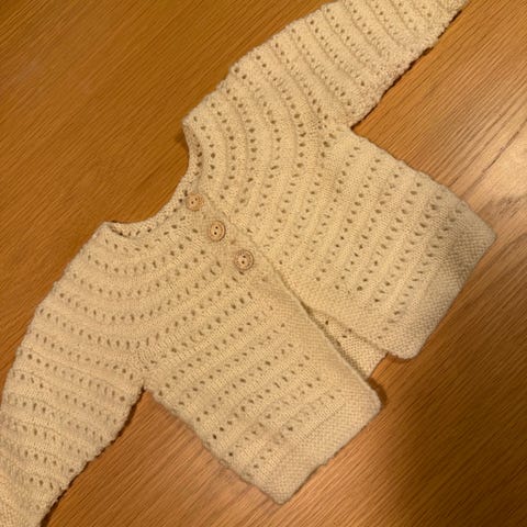 Heklet babyjakke i 100% bomull.