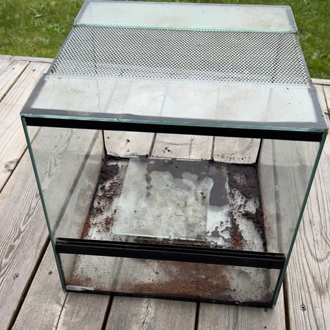 1 stk større terra på ca 120 x 40 x 40, øyemål. Ukjent merke. Glass plate i bånn er knust så må anses som et rep objekt. Dette gis bort mot henting.