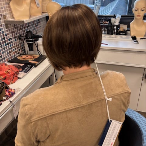 Eksklusiv syntetisk parykk selges. Kjøpt i frisør-/parykksalong ifjor høst for 8500kr. Brukt max 5 ganger da jeg fant ut at parykk ikke var noe for meg. Den er derfor svært lite brukt og fremstår som ny. Det følger også med et pleiesett bestående av sjampo, balsam, og balsamspray. Hodet til å ha parykken på følger også med. Den sitter meget godt og pent på hodet og har strikker bak i nakken som kan stilles inn slik at man selv bestemmer hvor stramt den skal sitte. Fargen på håret er mørkebrun. Bildet hvor jeg har parykken selv på hodet er den fargen som er mest lik virkeligheten.