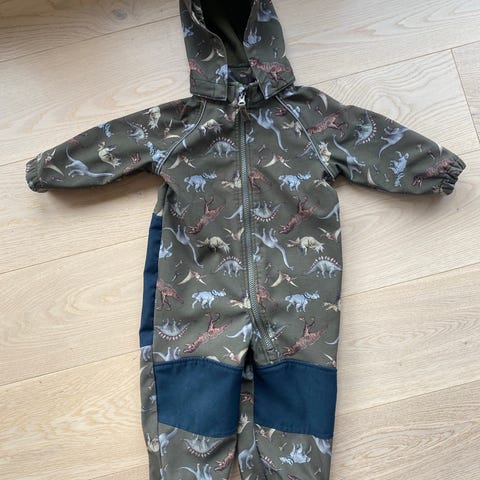 Vinterdress som er bruk av en gutt gjennom vinteren. Det er slitasje på knær og rumpe, men ikke hull og knappen på den ene beinet falt av med en gang og derfor ikke blitt brukt med strikk til skoene, men funker like fint med som uten. Ny pris var 800