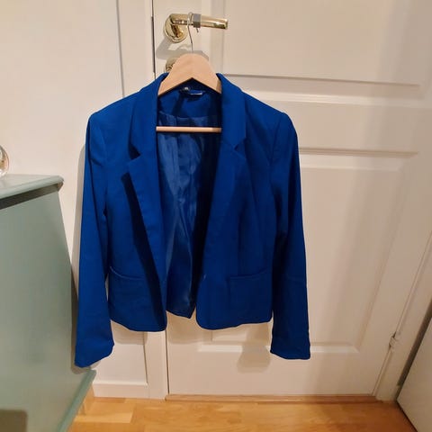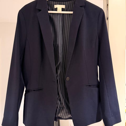 Fra H&M. Str 42 (tilsvarer str M). Marineblå. Ytterstoff; 63% polyester, 33% viskose, 4% elastan. For; 100% polyester. To lommer foran. En knapp foran, en pynteknapp nede på hver arm. Lengde bak fra skulder er 57 cm.