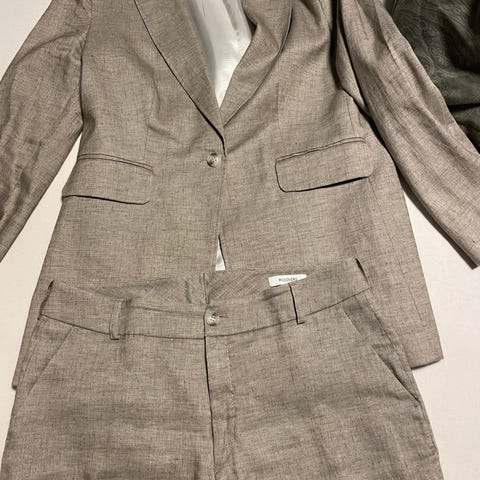 Blazer, skjørt og slacks i sildebensmønster.
