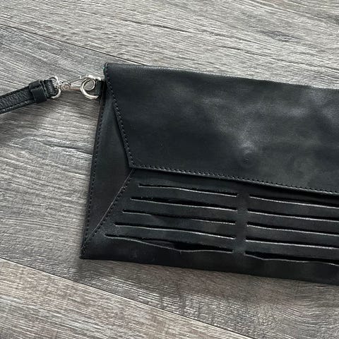 Veldig fin veske i skinn fra Depeche. 21,5 x 16 cm. Følger kun med en kort reim til håndleddet, men er så du kan sette på lang reim. Nå er det jo så mange kule reimer å få kjøpt så det burde ikke være noe problem. Lite brukt, fremstår som ny.