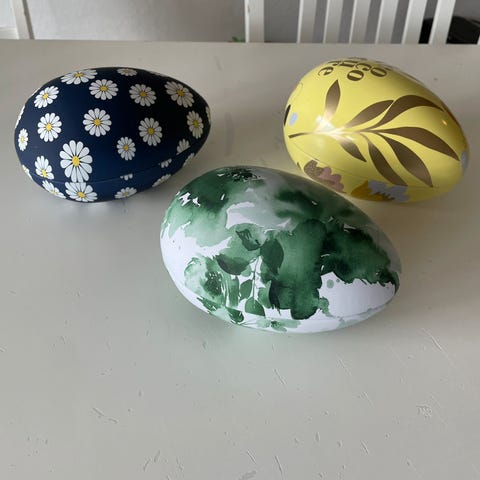 To påskeegg i plast, ca 20 cm høye selges. Kan demonteres (sokkel og egg) ved oppbevaring.
