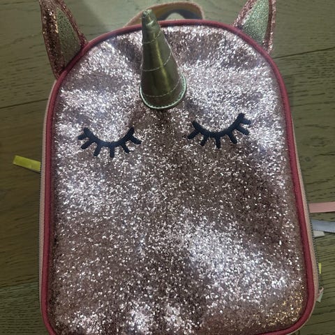 Sekk med unicorn enhjørning og glitter. Barnehagesekk. Får med enhjørningnøkkelknippe