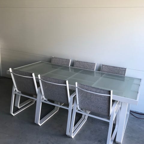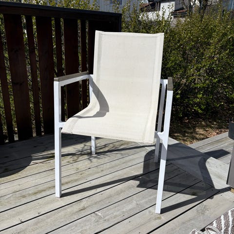4 stk. Rana stablestoler fra Brafab med bord selges. Settet har stått på et showroom og blitt brukt til fotografering. Stolen er stabelbar og er laget av hvitlakkert aluminium. Den har textilene i sete og rygg. Bordet har herdet glassplate med "printglassplate". Settet har en del merker etter transport til og fra fotografering. (Se detaljbilder) Settet har stått ute en vinter. Bordet: 150cm x 90cm Høyde 73cm. Selges grunnet plassmangel. Kan hentes i Moss.