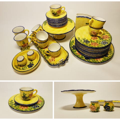 Nydelig servise i keramikk, produsert i Portugal. Et stort serveringsfat, 3 asjetter, 3 kaffekopper med 3 tefat samt 2 krus. Av merket Elpa Alcobaca. Sterke klare farger i gult, rødt, blått og grønt. I god stand. som ny. Ingen skår eller krakkeleringer. Mål: fatet 30 cm i diameter. Asjettene 22 cm i diameter. Kan selges noe enkeltvis. Pris: stort fat 210 kr, asjettene 110 kr pr stk, kaffekoppene med tefat 130 kr pr stk, ( 2 deler) krusene 90 kr pr. stk. Kan møtes i Trondheim sentrum eller sendes, godt innpakket, mot dekning av porto. Norgespakke med sporing og forsikring.