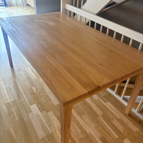 Massivt opprinnelig avlangt eikebord ( røykt eik) gjort om til et rundt bord.