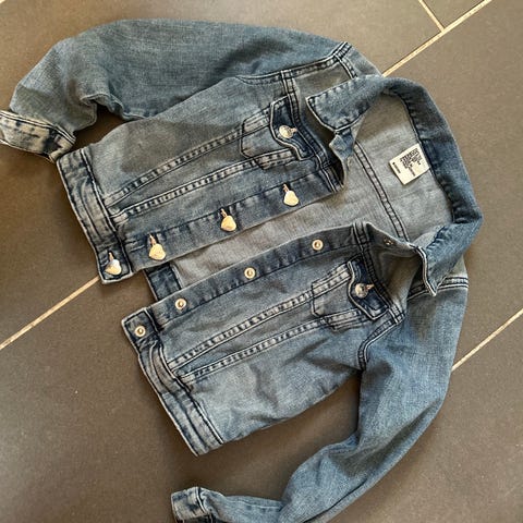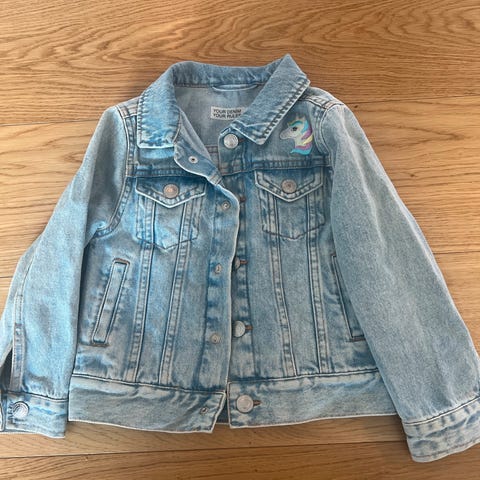 Kjempesøt olajakke med rosa blomster på. Kr 50,-