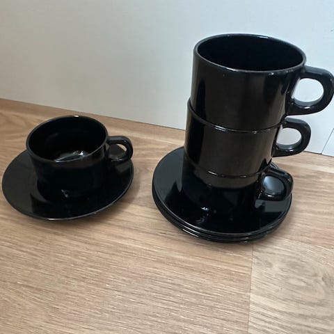 4 vintage Arcoroc franske espresso kopper med skål - Sorte. Fra 1980- tallet.