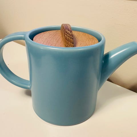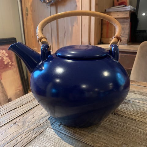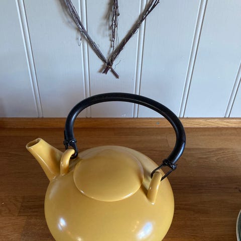 En stor, god tekanne i solid stentøy som holder på varmen.