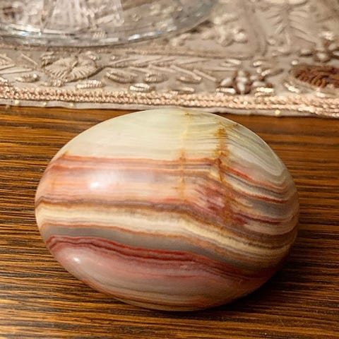 Nydelig kule el. ball i polert rosa jade - som er sjeldnere enn grønn jade - med tilhørende stativ. Glatt og fin i overflaten. Den er ca 8 cm høy inkl. stativet, ca 20 cm i omkrets, og den veier 340 gram. Kulen er kjøpt på tur til Taiwan.