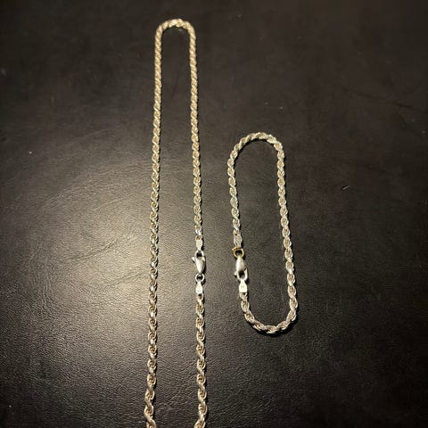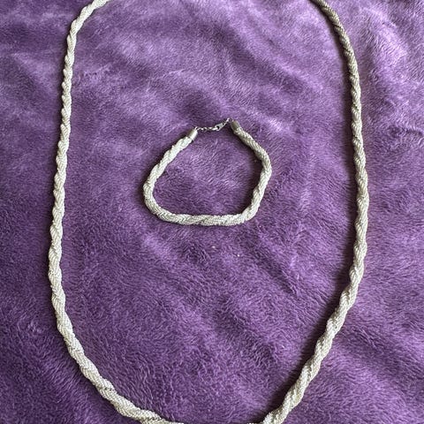 Sølvkjeder og armbånd, lite brukt, selges. Kjedene er sterling sølv, merket 925S. Langt kjede er 75 cm, veier 86g og er ca 7-8 mm, kort kjede er 43 cm, veier 50 g og er ca 7-8 mm, armbånd er ca. 3-4 mm, 20 cm og veier 10g.