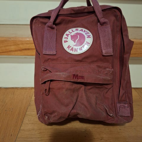 Selger en mer eller mindre ubrukt Fjällräven Kånken Mini ryggsekk. Er i fargen Ox Red. Den er muligens brukt 2-3 ganger til og fra barnehagen.