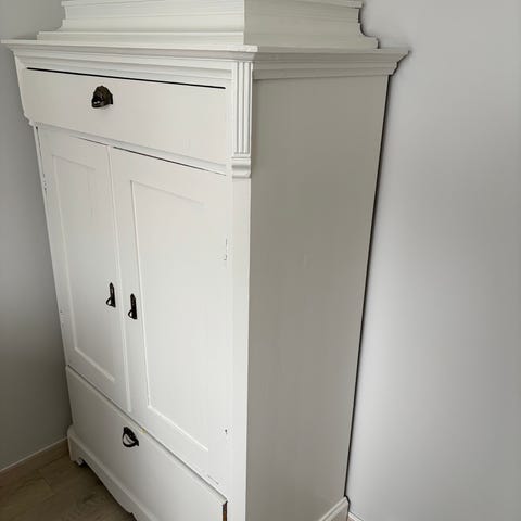 Gammelt og sjarmerende hjørneskap. Usikker på hvor gammelt det er. Ingen synlig bruksmerker, men nøkkel mangler, så får ikke åpnet den øverste delen. Har ikke prøvd med en annen nøkkel eller lignende da.