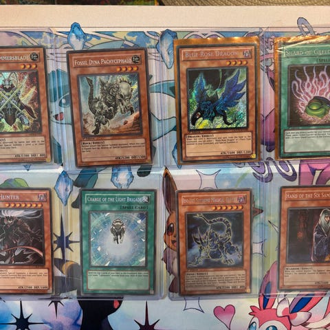 The majority of the cards are Yu-Gi-Oh with some Pokemon, Dragon Ball, and a few old Duel Monsters. A little less than half of the Yugioh cards are foils varying from super to secret rares. A big chunk of the bulk are part of vintage sets including LOB, SDK, SDY etc.