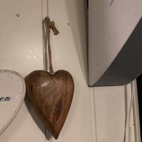 Vegghengt hjerte med "Velkommen til oss" i rustikk stil selges grunnet flytting.