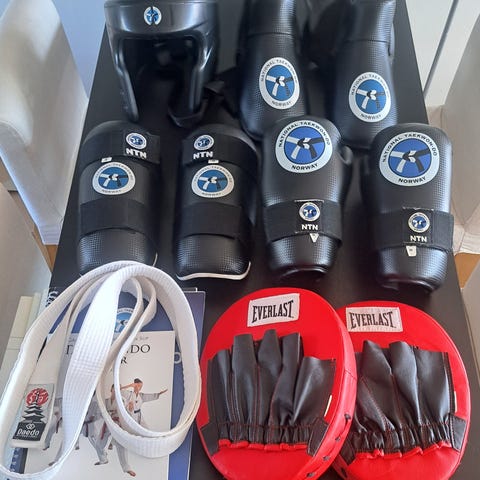 Kampsport tilbehør - Hvit belte (150cm), handsker (S), beskyttelse (susp) S
