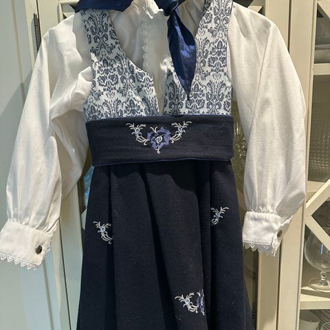 Denne drakten er laget av et skjørt, litt grov bomull, noen vakre rester og et vintage skjerf. Vesten er fôret med ny lin og blusen har jeg sydd av en nydelig duk med «no waste». Denne passer fint opp til 4 år med en standard bunadsskjorte som er litt større enn denne.