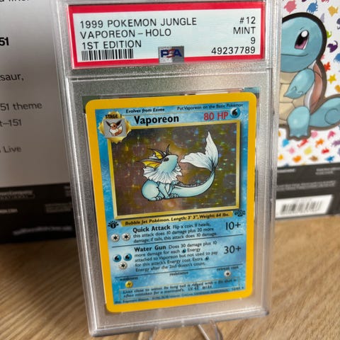 Jeg selger en Vaporeon Holo #12 fra Jungle i PSA 8. PSA blingsa og ga den en italiensk label i stedet for engelsk. Kan være et artig og fint samleobjekt for de som samler på Vapoeron.