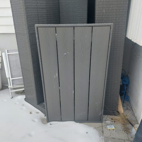 Hagemøbler i kunstig rotting i god stand. Møblene består av 4 deler. Det er 1 hjørnesofa, to tilstøtende sofaer og et bord