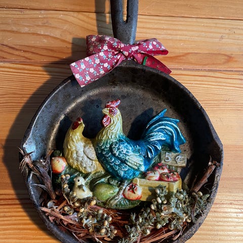 Flerfarget figur av høne og hane i metall, fra Portugal