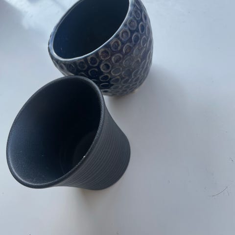 Selger et sett av 2 retro potteskjulere med nydelig mønster og flotte farger.